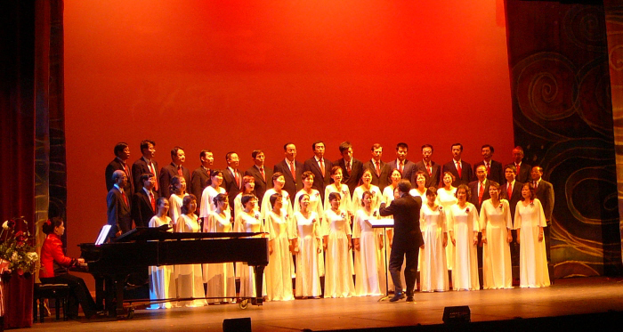 合唱团的大合唱, 是晚会不可缺少的重量级节目。享有盛名的指挥范卫平老师, 为此次演出精心挑选曲目,认真思考唱腔的运用, 安排不同声部的排练, 想尽一切办法来提高合唱的水平。 《枫叶》是一首新创作的无伴奏合唱歌曲。从艺术风格和合声的处理上, 都有它独特的风格,难度很大。当43名团员整齐的站在合唱台上,范老师的双手一举, 浑厚的女中音部唱起了“枫叶, 深秋的叶, 风叶, 飘飞的红叶…”, 醇美的声音在剧场上空回旋, 男低男高声部随之慢慢的溶进去, 女高音再轻轻的飘入到合声中, 这起伏跌宕一回三转的和谐混声, 表现了送走无悔的岁月, 迎来收获的金秋的无限感慨, 展示象枫叶一样如诗如话的情操和精神, 用深情的歌声抒发着人生的情怀。 “阿拉木罕住哪里? 土鲁番西三百六….” 风格鲜明的合唱《阿拉木罕》,节奏明快,激情饱满,男女声部一问一答、一轻一重的对比效果,使观众们都沉浸在每一位合唱参与者所创造的青春浪漫的爱的旋涡之中,享受着这首著名歌王王洛宾的经典曲目。