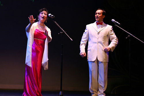 晚会的重头戏,两位著名的歌唱家,吴碧霞和周灵燕同时在晚会上献艺,精彩纷呈,高潮迭起。当著名歌唱家周灵燕身穿淡黄色的盛装, 满面春风的走上台时,观众席上响起一片掌声。 “我和我的祖国,一刻也不能分割… ”,甜美的歌声飘荡在演出大厅,央视春晚的百灵此刻在芝加哥《金秋皓月》的舞台唱响。接着,曾经荣获全军声乐比赛一等奖, 谦逊温和的周老师,请出了芝加哥地区享有盛名的表演艺术家董晨空老师和她合作表演《刘海砍樵》。说起董晨空, 也许还有不少的人记忆犹新, 当年的芝加哥第一届卡拉OK大奖赛第一名,两次享有盛名的黄河大合唱的朗诵者。事过多年,他仍不减当年,风采依然。他们一举一足, 有板有眼, 娇媚的娘子赞美郎,多趣的郎君夸娇妻,为晚会带起一个高潮。接下来东方艺术团合唱团和舞蹈团的演员们, 和周老师一起表演了彝族的经典歌曲《远方的客人请你留下来》。艳丽的彝族大摆裙,娇小的白族红花衣,苍劲的彝族牛角帽, 周老师快乐的歌声,四周欢快的伴声,加上八位彝族盛装的舞者,一时间,场上满目璀璨,欢声迭起,晚会进入了高潮。