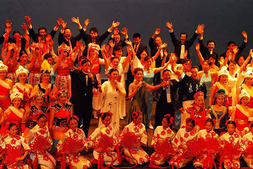 两个多个小时的演出, 在卫鸿、包敏、周灵燕、张学平领唱的《节日欢歌》中走进了尾声。五彩的服饰, 旋转的彩灯,近百名演员上台齐唱, 近百名演员在笑,鲜花中, 观众们在欢呼, 镁光灯在闪烁, 朋友们在拥抱, 各界政府官员、侨领代表,纷纷走上台来,对演员们表示祝贺,对当晚的演出给与高度评价。总领事黄屏先生在登台与演员合影时说,东方艺术团的成功演出真实反映了悠久中华文化的多姿多彩和当今华人的精神风貌,为主流社会带来了真正的东方艺术和华人形象,祝贺你们。