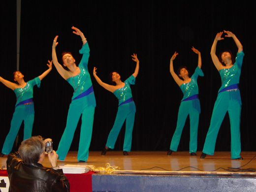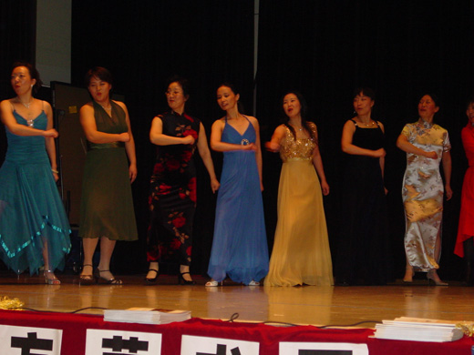 在今年11月10日东方艺术团的《金秋皓月》晚会上,综艺团的表演唱《龙船调》以生动活泼的表演给观众留下了深刻的印象。四位小伙儿争着摆渡姑娘过河的诙谐情节,也让东方艺术团的团员们羡慕。东方诗人毛一明、刘正白等演出后便写下了一首首诗,字字句句渗透了对生活的热爱。这样的好诗,立刻传遍了东方艺术团,也激起了团里卫鸿老师内心的音乐创作冲动。卫老师深夜创作,一气呵成,一首以山东吕梁风格为基调的歌产生了,并在艺术团内唱响了。此刻,在卫鸿老师的伴奏下,许多团员登台联合演唱了这首被称之为《龙船调续集》的歌,受到了大家的热烈欢迎。合唱团的表演唱《戏唱东方》由阎伟蓉和赵玥开场,带出一队身着红色上装的娘子军。她们将大家耳熟能祥的老歌配上新词,串在一起,又唱又跳,唱的是东方的欢乐,跳的是东方的明天。“花蓝的花儿香, 听我来唱东方, 东方是个好地方,又跳舞来又歌唱…”。当她们深情地唱到绣红旗时,一面东方艺术团的大旗在舞台上拉开,表演者们一个个陶醉地将东方的旗织贴在脸旁,台上台下一片喝彩声,晚会达到了高潮。之后,这支娘子军捧着东方的旗帜,踏着整齐的步伐,唱着“古有花木兰,替父去充军,东方娘子军,唱歌为开心,向前进,向前,…… ”,走下舞台。为娱乐表演画下了圆满的句号。