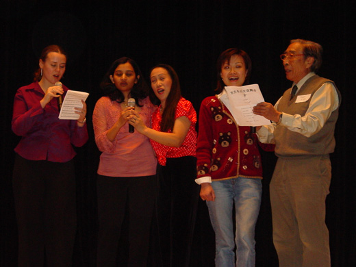 东方艺术团当晚的聚会还是一个才艺表演的盛会。东方艺术团各个分团的团员们多才多艺,能舞能唱还能说。当主持人包敏、郭玲、刘承熹宣布东方艺术团才艺表演现在开始之后,一个个的节目都陆续上台表演。当晚表演的10个节目, 大都是由团员们自己编写创作。说的是东方自己的人,唱的是东方自己的歌,演的是东方自己的事。台下的观众听到这台上的戏中戏,个个捧腹大笑,前仰后合。舞蹈团的三句半《话说东方》由陈颖创作,张丽明、林莹、陈颖、梁艳四人表演,她们配合默契,包袱迭出,巧妙地描写了东方的人和事,特别是那个半句,个个精彩,赢得了一遍又一遍的掌声。舞蹈团表演的另一个节目,身穿时装的美女们,婆裟袅袅地站在台上,光彩夺目,楚楚动人,正当观众欣赏之际,突然,她们开口唱起了粗旷的男声小合唱,笑得观众喘不过气来。戏曲团的刘汉平表演东北二人转《松花江上》,唱的有板有眼,有滋有味。戏曲团周静的现代京剧《杜鹃山》选段也唱得气势如虹,博得满堂喝彩。合唱团的熊家汇、范方秀夫妇是来自湖北武汉的资深歌唱爱好者,长期活跃在舞台上。他们俩一首《纤夫的爱与妹要过河》唱得有情有意,声情并茂,熊哥哥唱得粗壮憨厚,范妹妹唱得甜美温柔,因为他们来自长江岸边,所以更是有着生活的原汁原味。特邀参加活动的还有来自西北大学的德国博士生Aleng和印度博士生Lisha。她们给东方的朋友们带来了异国的风情,观众们热烈地鼓掌,感谢她们在大雪天远道赶来参与东方艺术团的活动。