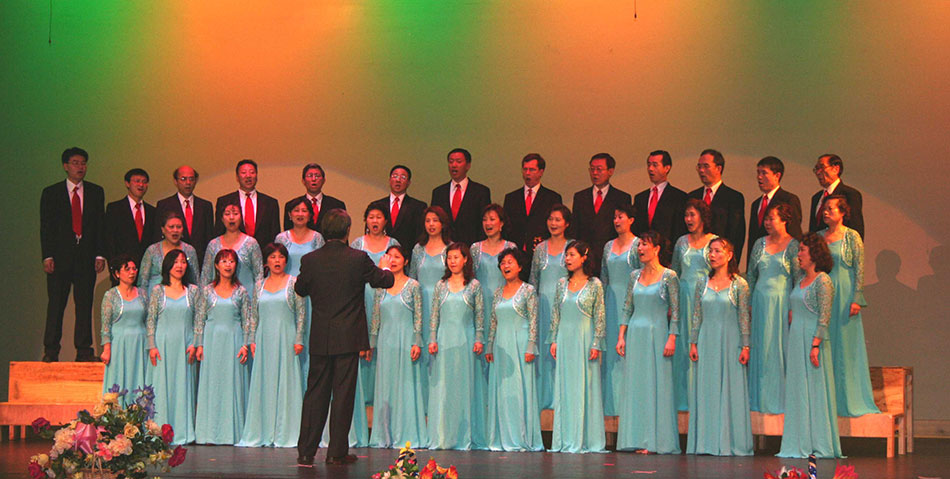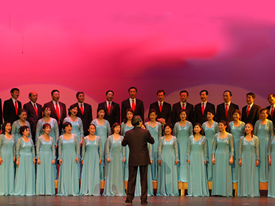 大合唱是整台晚会不可缺少的重头戏, 蔚蓝色的连衣裙,端庄的黑礼服,鲜红的领带,焕发的精神面貌,吸引了观众。无伴奏合唱的第一支歌曲是经典曲目—“摇篮曲”。安详的歌声,恬静的夜空,歌声轻轻地刻画出了一幅祥和温柔的母子图。 第二支歌“牧歌”,悠扬飘远, 一望无边,飘然的男高声,明亮的女高声, 华丽的女中声, 混厚的男低声,和谐合作,呼应起伏,缠绵往复,表现出在辽阔的草原上, 蓝天白云下,绿草、白云、羊群和牧民的幸福生活。指挥范卫平老师为这次的合唱曲目,费了不少心血,逐字逐句的辅导,反复练习,才有今天演唱的成功。他的无私奉献精神,感动了合唱团的每一位团员。