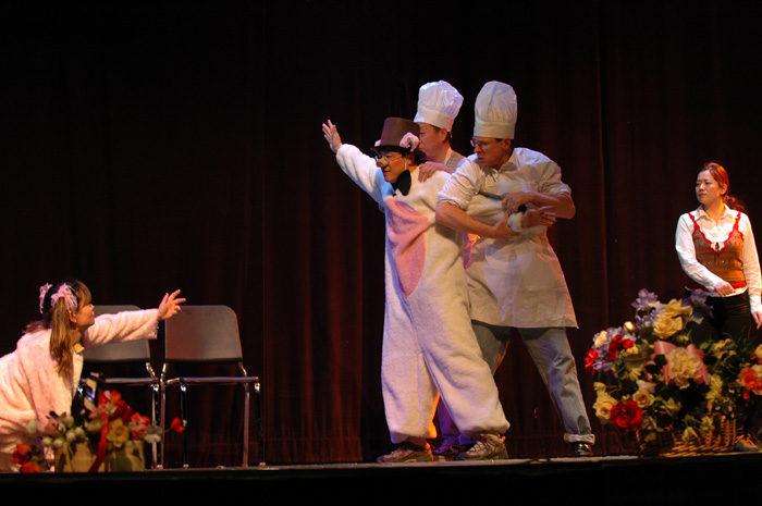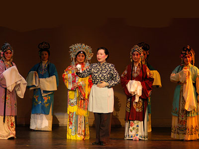 自二月下旬以来,戏曲团每个星期的排练都是排得满满的。京剧的服装,化妆都是特殊的学问,特别是旦角的化妆程序和头饰很复杂。在一次次化妆练习中大家深切体会到“粉墨登场”之不易,估计这次七个演员需花五个多小时在化妆上。一般剧团的服装和化妆都各有专司,而这里的情况却要求我们做剧情中、英文解说,制作服装道具,伴奏带,自己动手,人人上阵,互相帮忙,成为多面手。除了自己化妆外,还要互相帮助包头,带头饰,穿戏服。有演出任务当然要忙练习化妆和身段,这次没有参加演出的团员则帮助置办行头,收集资料,吊嗓练唱,各尽所能,争当幕后英雄。李冬龄一人身兼数“职”,既是演员,又是英文字幕翻译,还帮助缝制裙子。