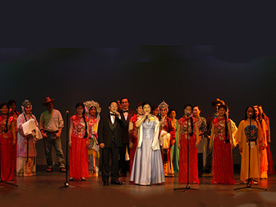 新成立的戏曲团, 首次彩装亮相。在四位蓝红绿黄的宫女的簇拥下,缓缓步上。这些芝加哥的京剧票友们,华丽的戏服,规矩的彩妆,凤冠玉珠,龙袍马褂,五光十色,绚丽多彩。他们演唱的京剧经典唱段联唱“行云流水”包括了梅派,程派,荀派的各个名段,由副团长梁艳带领首先开口“你见…好喜欢….”,一段穆桂英挂帅插曲,一句高腔,唱得满堂彩,“啊…”,“好….”,“棒…” 全场响起了雷鸣般的掌声。紧接着老旦的“对花腔”、 “生死恨”、”红娘”、 “锁麟囊”、 “阿庆嫂”,一段唱的比一段精彩。高昂的唱腔,缠绵的小生,委婉的流水,段段有板, 字字有腔。看到他们的表演,观众们情不自禁的为中国有这样灿烂辉煌的京剧而感到自豪。人美戏好, 戏曲团的表演,是当晚最出彩的节目,也成为芝加哥首次京剧舞台的最大亮点,让在场的美国朋友, 首次领会了中国”OPERY”的魅力, 他们也情不自禁的欢呼加油。