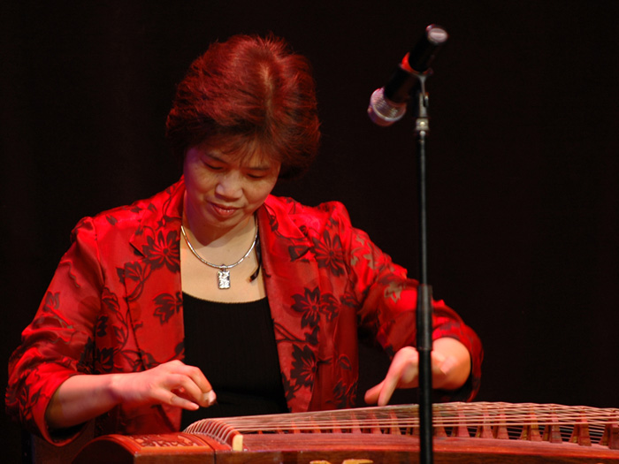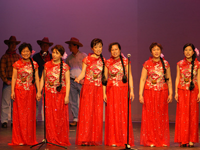 表演唱“桃花红, 杏花白”,是一支山西左权地区的著名民歌。合唱团的团员们用深情朴实的表演形式,艺术地刻划了栩栩如生的人物,山西大妹子炽热大胆的爱,三晋小伙子朴实憨厚的情,唱腔优美,歌词朴实动人。芝加哥著名歌唱家卫鸿和著名表演艺术家董成空担任领唱。女声小合唱的一段别有情调: “榆树树你就开花, 疙乍乍你就多, 你的心眼儿比俺哦多呀, 啊个呀呀呆..” 。歌声象一股山间的涓涓流水,缓缓地流出少女们对爱情的羞涩,表现了多情又多意的缠绵初恋。舞台上,山清水秀的背景,淡淡雅雅的灯光,乡土气味浓厚的农民打扮,引起了观众的一片惊叹,现场又掀起了高潮。当舞台上展现出一幅光彩夺目的农村风情画时,观众直接呼喊着再来一次,“真是太美了!”