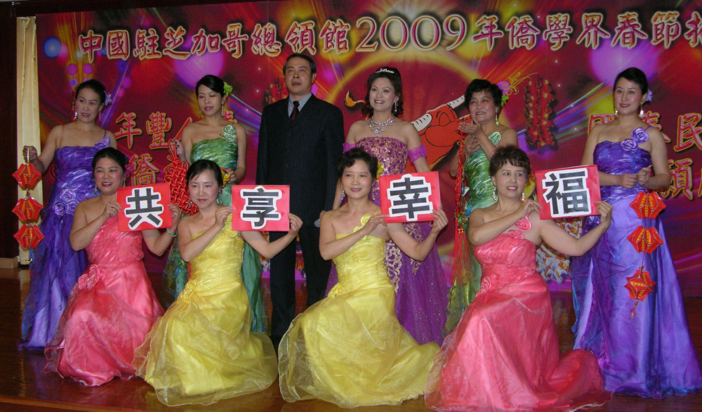 2009年1月19日芝加哥的夜晚, 寒风凛冽, 雪花飘飘。在中国城的南端, 富丽华大酒楼的三楼,中国驻芝加哥总领馆2009年侨学界春节招待会正在一片喜庆的气氛中进行。黄屏总领事发表了热情洋溢的讲话,对芝加哥地区的华人表达了节日的问候。接着,文艺表演开始。东方艺术团的表演联唱《节日欢歌》掀起了晚会的高潮。由歌唱家范卫平和倪申申领唱的“共享幸福”, 在八位身着彩裙的歌舞表演者的衬托下,温馨闪亮登场。他们声情并茂的演唱,将张灯结彩共享幸福的美意,送到了每一位观众的心头。当歌声继续在大厅萦绕,观众们都沉浸在甜美幸福之中时,欢庆的锣鼓砰然响起,喜庆的锁吶在吹,十六把粉红的绢扇,象飞舞的蝴蝶,迎出了东方京剧团的梁艳、文艺、和刘汉平医师。他们三人同唱京歌“共创世纪”。歌声京味浓郁,如行云流水,穿檐过壁,千回百转,气势磅礴,唱出了华人的节日心声。“新世纪发下将军令,青山绿水也奔腾;山呼海啸惊世界,且看未来更恢宏。”