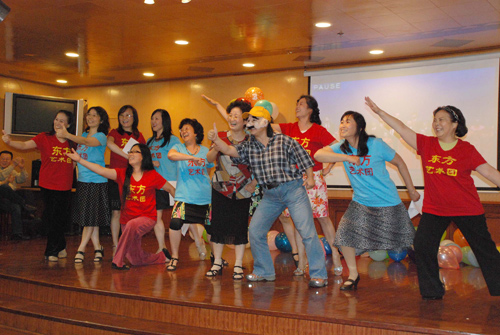 综艺团十二个装扮成老头老太太的节目“老两口唱东方”别具一格。特别是卫鸿和梁燕的男扮女装,诙谐幽默,生动逼真,让现场的人们笑得前仰后合。张吉清组织的这个节目,自编自导,唱出了对东方艺术团的爱。歌词唱道“东方艺术团是我们的大家园,心情舒畅人人都喜欢,团结一致建设东方, 永呀嘛永向前”。肺腑之言表达了团员们的心声,获得了热烈掌声。