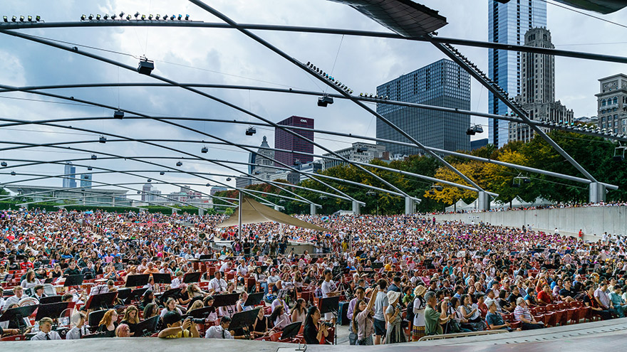 由获得普利策建筑奖和国家艺术设计勋章的世界著名设计大师Frank Gehry设计的Jay Pritzker Pavilion露天音乐厅观众区有 4000个固定座位和可容纳10000名观众的草坪区。千禧公园敞开式的天篷音响效果是目前世界上最为先进的室外音乐会技术,其音响系统和扩音设备均达到世界一流水平,音响系统可传送到观众席的每个角度。可以容纳上万人的观众区草坪区不需要票,欢迎大家自带食物,饮料及野餐椅等在草坪区来感受千禧公园的世界最为先进的室外音响其音响系统和扩音设备。