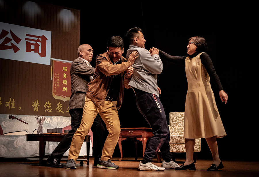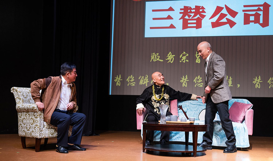 演出的最后一个剧目是荒诞短剧《三替公司》。三位不甘过平庸人生的球友一起成立了一家《三替公司》,公司因为接了替人约会和替人颁奖的活,而引发了一连串的笑话。五位演员(其中李莉扮演在出版社工作的李小姐,李力扬、刘承熹和牛明恺扮演三位公司创始人,李敏扮演作家)配合默契,精准地把握了喜剧的节奏,他们本着"一本正经地搞笑"的原则,将作品的荒诞气质进行了极致的表达。《三替公司》将演出推向高潮。在演员们不断抖落的包袱中,观众的笑声此起彼伏,整个剧场变成了欢乐的海洋。最后,演出在《三替公司》三位创始人极具喜感的舞蹈表演中,在观众热烈的掌声和欢呼声中,圆满落下帷幕。